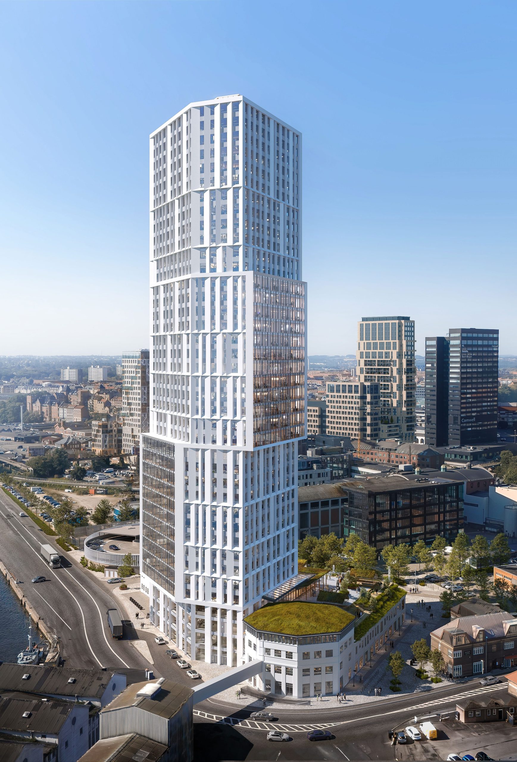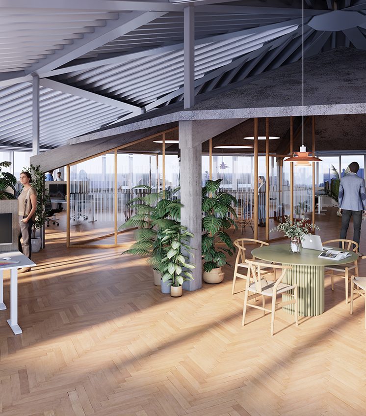 Taghaven bliver et frodigt grønt rum med drivhuse, blomster og træer – et sted, hvor man kan trække vejret, tage en pause eller mødes uformelt. På bytorvet skaber træer, beplantning og smukke belægninger et levende miljø, hvor mennesker naturligt samles, opholder sig og passerer igennem.