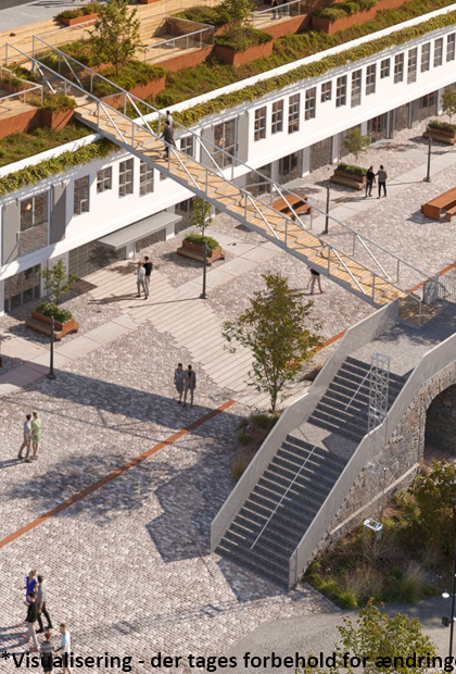 De dele af bygningen, der står tilbage, bliver moderniseret og tilpasset nutidens behov. På toppen etableres en grøn taghave, og omkring bygningen skabes et åbent torv med plads til ophold og byliv.